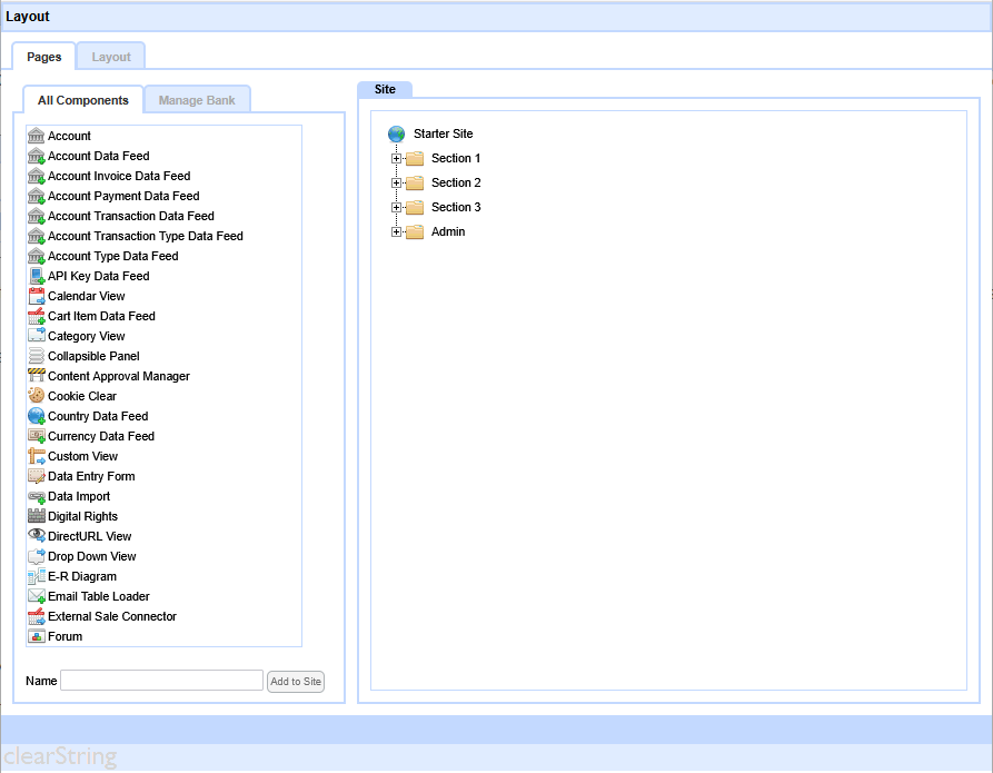 The most basic components are the Page: a Page is a simple webpage, but which can also form branches to the site-tree. The body of a webpage is 'surrounded' by Layout. The Layout Elements control the main appearance of the site and the navigation.  Navigation is automatic in a clearString app - as the site is built the navigation will automatically create the links in the style you define.