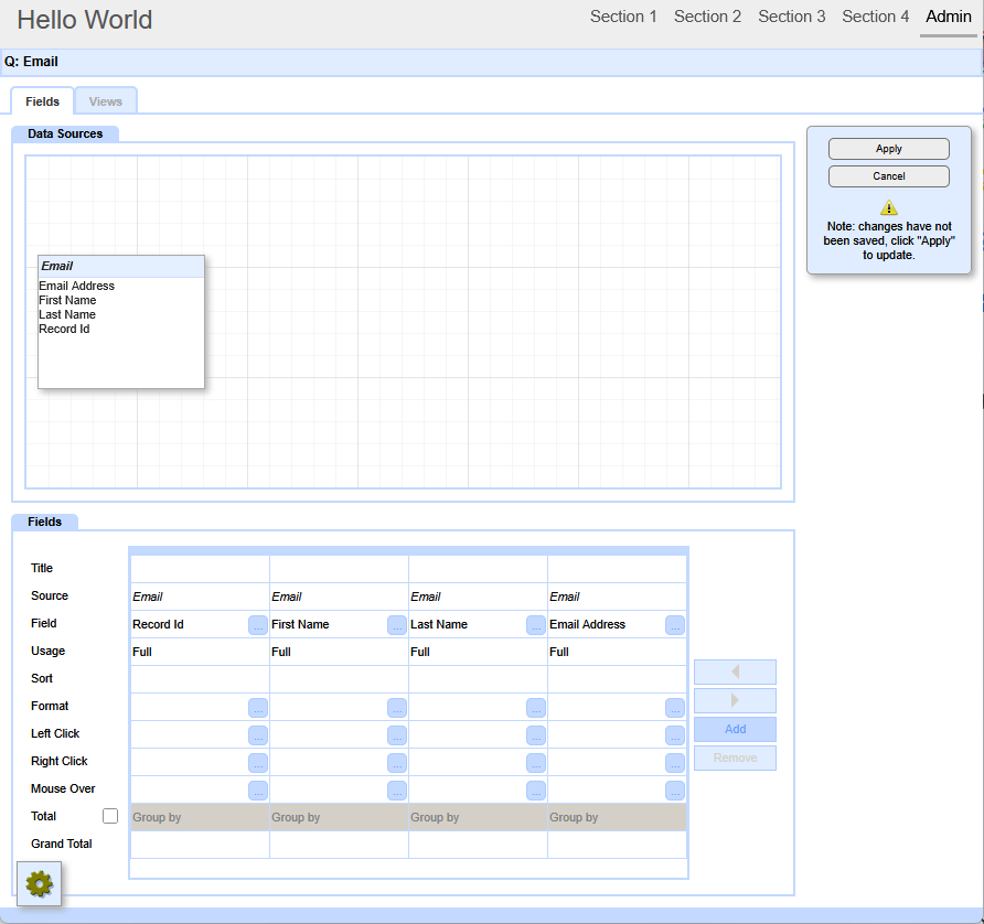 Add the Fields from the Email 'Form Table' to the Query window - you can click-and-drag or simply double-click. If you want to change sequence or remove a Field you can select the field by the thin header-bar and use the controls to the right to change position or remove a column.
