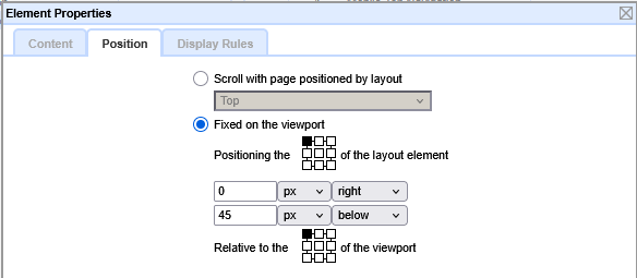 Set the Position to be fixed on the viewport, anchored in the top-left.