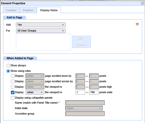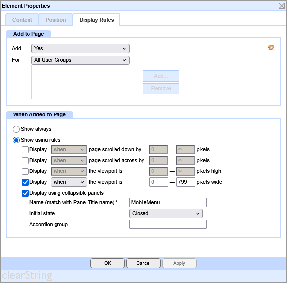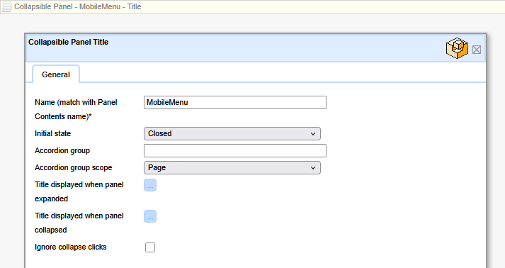 Set it to Display using collapsible panels, and give it a Name to match the panels you will be using: MobileMenu